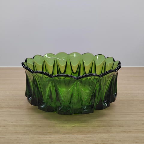 Lasinen tarjoilukulho jossa on koristeellinen reuna ja kirkas väri. Kulho on pyöreä ja sopii esimerkiksi tarjoiluun tai koristekäyttöön. Materiaali on läpinäkyvä lasi. Ollut tuotannossa vuosina 1915- 1970 halkaisija n 20 cm korkeus n 7 min. Muuten kunto hyvä paitsi pohjarenkaassa paikoin rosoisuutta ja ja n 2 cm matkalta puuttuu pala pohjarenkasta. Ei naarmuja ei muita vikoja