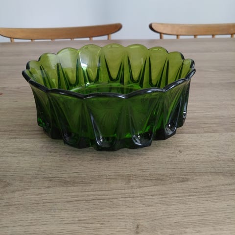 Lasinen tarjoilukulho jossa on koristeellinen reuna ja kirkas väri. Kulho on pyöreä ja sopii esimerkiksi tarjoiluun tai koristekäyttöön. Materiaali on läpinäkyvä lasi. Ollut tuotannossa vuosina 1915- 1970 halkaisija n 20 cm korkeus n 7 cm. Muuten kunto hyvä paitsi pohjarenkaassa paikoin rosoisuutta ja ja n 2 cm matkalta puuttuu pala pohjarenkasta. Ei naarmuja ei muita vikoja