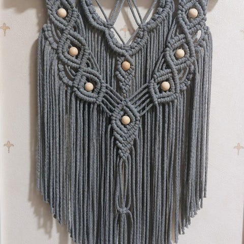 Valkoisesta Paulina-langasta koristeelliseen oksaan solmittu työ.