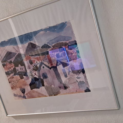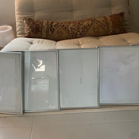 Naarmuton lasi ja kulmissa ruuvatut metallivahvikkeet.