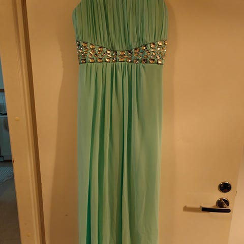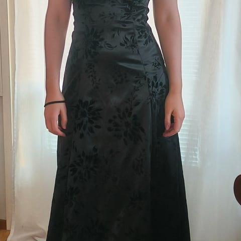 Ihana tumman vihreä iltapuku vaikka vujuihin! Kerran käytetty. Kaupan päälle saa erikseen ostetun saman värisen hartiahuivin (näkyy toisessa kuvassa). Edessä halkio. Lyhennetty, joten sopii noin 155-160 cm pitkälle. Lyhennys tehty ompelijialla, mutta jälki ei oe täysin tasainen, näkyy kuvassa.