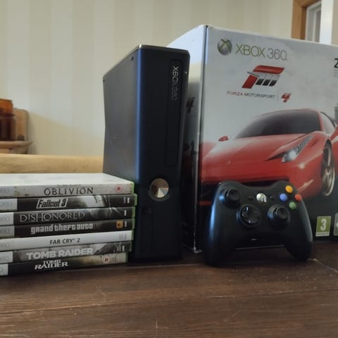 Microsoft Xbox 360 pelikonsoli neljällä ohjaimella ja laturilla