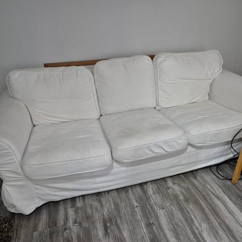 Ikean 3-istuttava Ektorp sohva. Toinen käsinoja on vähän löysä, mutta se ei vaikuta käyttöä. Istuintyynyt hieman nyppyyntyneet. Koiratalous! :)