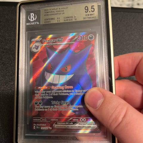 Pokémon Gengar -keräilykortti, holografinen versio. Kortti on suojattu muovikoteloon, jossa näkyy myös PSA-sertifiointitiedot.