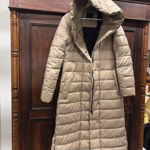 Ollut savuttomassa koirataloudessa. Kokomerkintä 36/38, eli menee monelle koolle. Olen itse M-kokoinen ja päälle on mahtunut paksu villapaita takin alle. S-kokoiselle ihanan oversize. Takki ulottuu nilkkoihin asti.