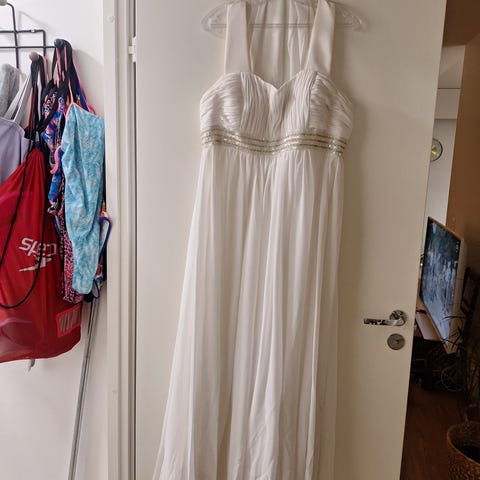 Jj Housesta ostettu valkoinen raskaushäämekko. Useita laskoksia ja halkio toisessa jalassa. Pitkät valkoiset nauhat saa sidottua eteen tai taakse. Vetoketju takana. Pesty. Jos kiinnostuit voin laittaa kuvia mekosta päällä. Haku Turusta tai postitus. Pukupussin saa mukaan.