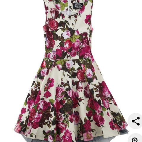 T-paitamekko, pehmeää puuvillaa. Helmassa kirjailtu tylli ja kimaltava teksti ”Princess”. Oli päällä syntymäpäivänä, sen jälkeen lojunut kaapissa. Koko 128, mutta reilu, ja materiaali venyy. Erittäin pehmeä ja mukava päällä.