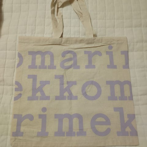 Marimekko logokassi. Uusi käyttämätön. Teksti laventelin värinen. Pohjaväri lähinnä vaaleaa pellavaa.