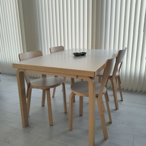 Artek 97 jatkettava ruokapöytä, jossa on koivurunko ja lasikansi. Pituus 135 cm, jatkopalan kanssa 190 cm. Väri: koivu, valkoinen.