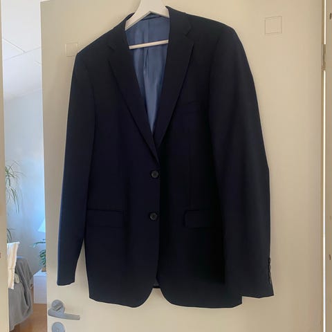 Dressmann sininen miesten puku takki, koko L. Takissa on kaksi nappia, sisätaskut ja takana halkio. Materiaali koostuu 53% polyesteriä ja 47% villaa. Valmistettu Kiinassa.