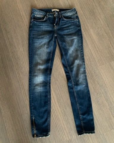 Gina Tricot Kristen farkut sinisessä värissä, naisten 29/30, vyötärönympäryksen halkaisija mitattuna noin 37cm. Farkuissa on kulutuksen jälkiä ja repeämiä, jotka näkyvät kuvissa. Materiaali on farkkukangasta, sopivat arkikäyttöön. Normaali korkeus, kapealahkeiset, skinnyt, lahkeissa lyhyet vetoketjut.