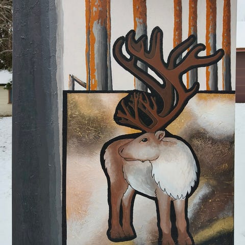Maalaus, joka esittää poroja talvisessa maisemassa. Teos sisältää luonnon elementtejä kuten puita ja lumista maastoa. Värit ovat hillityt ja kuva on kehystetty valkoisella kehyksellä.