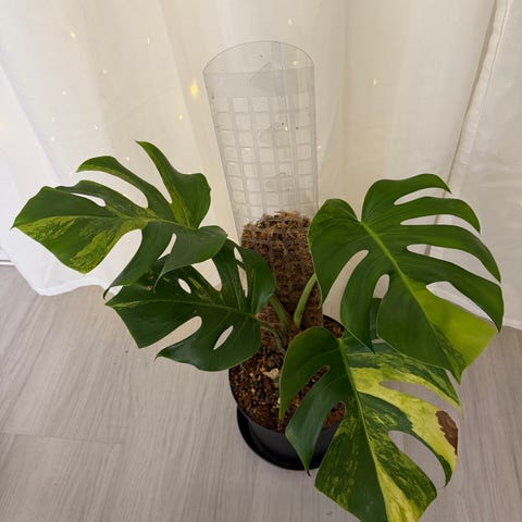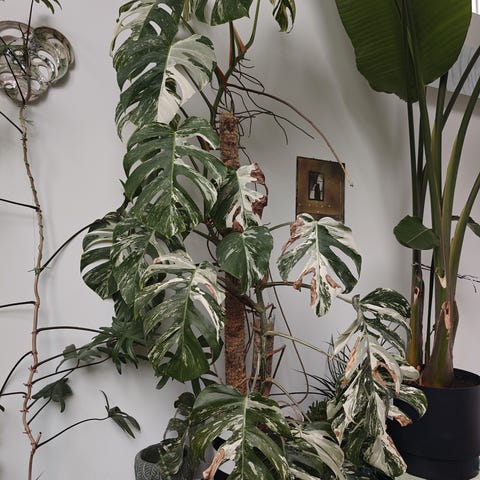 Iso monstera aurea emokasvi sammaltolpalla, latva leikattu tänään ja se jää itselle. Kasvupisteessä näyttäisi olevan hyvä väritys, tekee todennäköisesti nopeasti uuteenkin kasvuun isoja lehtiä kun valot kunnossa. Viimeisessä kuvassa näkyy ennen latvan leikkausta.