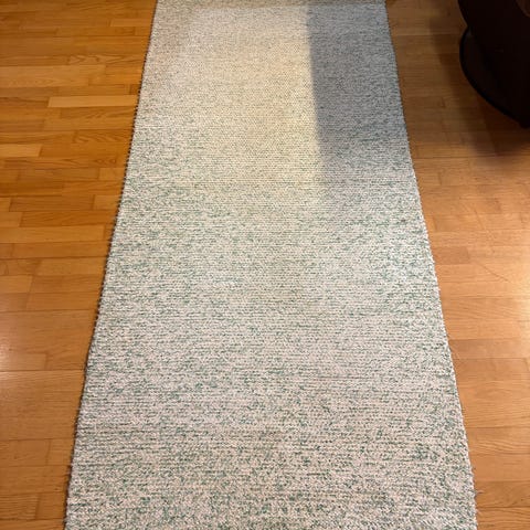 Käsinkudottu valko-vihreä räsymatto