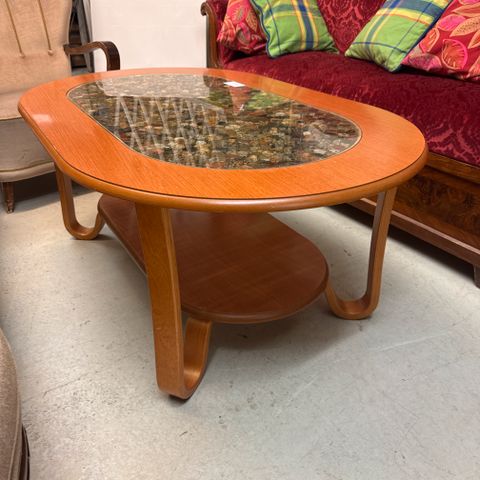 Lasinen sohvapöytä, jossa maitolasinen välihylly