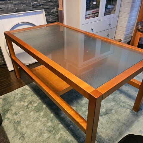 Lasinen, elämää runsaasti nähnyt Askon sohvapöytä. Yhdestä kulmasta lohjennut pala, yhdessä jalassa maalijälkeä ja pinnassa jonkin verran naarmuja. Siitä huolimatta kuitenkin oikein käyttökelpoinen ja todella raskas pöytä.