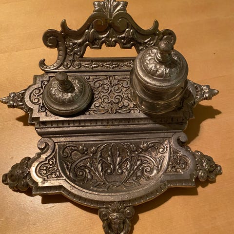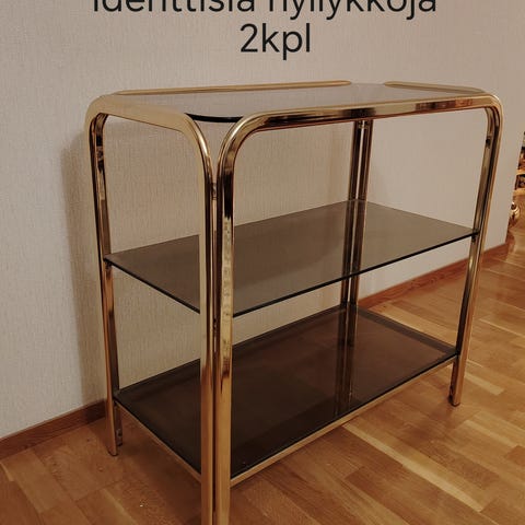 Messinkinen vanha juomateline laseille. Mahtuu 6 lasia. Hyvässä kunnossa, vaikka ikää alkaa olemaan. Hintaan lisätään mahdolliset postikulut.