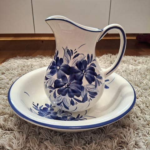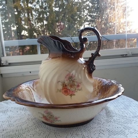 vaniljan värinen ruusu kuviolla. Vadin halkaisija 30 ja korkeus 10 cm. Kannun leveys 14 ja korkeus 23 cm. Soveltuu koriste- tai käyttöesineeksi. Varattu 7.12 asti