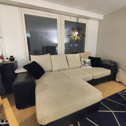 Annetaan kulmasohva. Kaikki muu on kuin oli uusi mutta, kohta mistä sohvaa vedetään, että voisi nukkua on mennyt rikki joten ei toimi. Muuten kaikki mintissä.