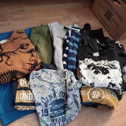 Hyväkuntoinen vaatesetti, koko 134-140. Merkkejä mm. Gant, PompDeLux, Villervalla, Me&I, Adidas. Gantin neule priimakuntoinen. Tummentumat kuvassa vain varjoja, ryppyisiä voivat olla. Vain nouto.