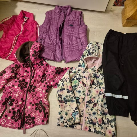 Myyn Everest vk housut, takki ja Fix merkkinen vk-takki. Lindex fix toppahousut (pinnassa karvoja jostain villapuserost, eli ei ole pinnassa naarmuja tai kulumista). Reiman kevyt toppatakki. Koko 110 /116.