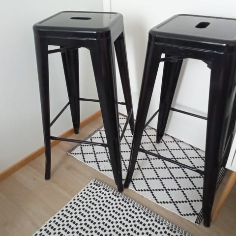 Metallinen baarijakkara, 2 kappaletta, kromattu teräsmateriaali. Jakkarat ovat säädettävällä korkeudella, istuimessa rei'itetty muotoilu.
