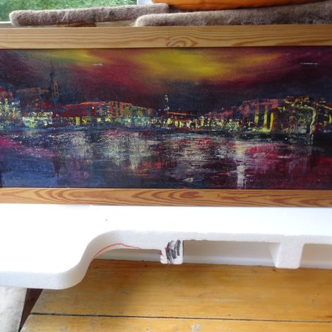 Maisemamaalaus taulu kehyksissä tornionjokivarrelta V. Kallisen maalaama, jossa näkyy talvimaisema ja rakennuksia. Kehykset ovat koristeelliset ja usean kerroksen värisävyt sisältävät kullan ja ruskean sävyjä. Taulun koko ilman kehyksiä, leveys 63cm, korkeus 21cm. Taulu soveltuu seinäkoristeeksi erilaisiin tiloihin. TEE TARJOUS!!!!