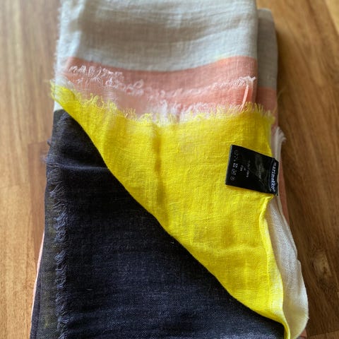 Marimekko huivi, oranssi/tummansini -raidallinen, puuvillatrikoo, 18x220cm, käytetty, siisti ja ehjä.