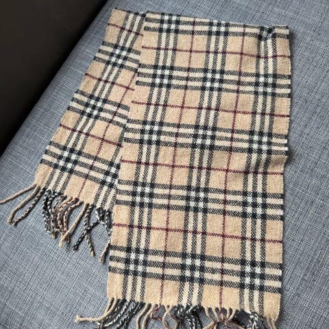 Burberryn iso kelta-viher-harmaa-valko huivi. Koko 32 cm x 165 cm. 100% kashmir villaa. Postitus tai nouto Kivikosta.