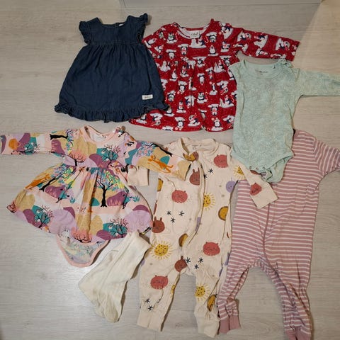 Siistikuntoinen pieni vaatesetti. Setissä mukana Disney Baby 101 Dalmatialaista collegetakki, Newbie collegehousut ja DIY pitkähihainen trikoopaita. Kaikki vaatteet ehjiä ja tahrattomia. Housuissa jonkin verran pesunukkaa.