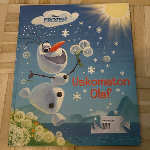 Disney Frozen lasten kirja, jossa on hahmot Elsa, Anna ja Olaf. Kirja on suomenkielinen ja sisältää tarinan Frozen-elokuvasta. Sopii lapsille ja sisältää värikkäitä kuvia.