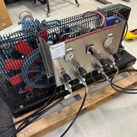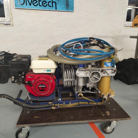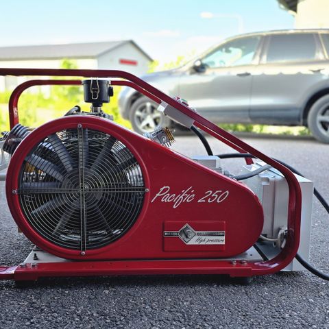 Sukelluskeskuksen käytöstä hyvin huollettu täysin koteloitu (hiljainen) automaattisella vedetysjärjestelmällä oleva todella siisti ja varmatoiminen laite. Automaattisella sammutuksella 300 ja 232 bar. (Kone sammuu kun pullot täynnä). Varustettu kahdella 232 bar täyttöletkulla sekä kahdella 300 bar täyttöletkulla. Säännöllisesti huollettu hyvä ja siisti kone. Tuotto 219 litraa/ min.