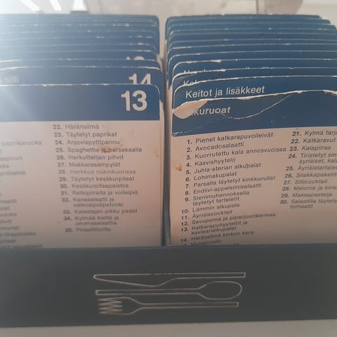 Mestarikokki reseptikorttisarja sisältää useita ohjekortteja eri ruoanlaiton aiheista. Kortit ovat oransseja ja punaisia, ja ne on järjestetty laatikossa. Sarja sisältää ohjeita muun muassa kalasta, lihoista, leivonnasta ja säilönnästä, myös joitakin kasvisruokareseptejä. Kortit ovat suomenkielisiä ja soveltuvat kotikeittiön käyttöön. Tässä laatikossa ei ole sarjan kaikkia kortteja.