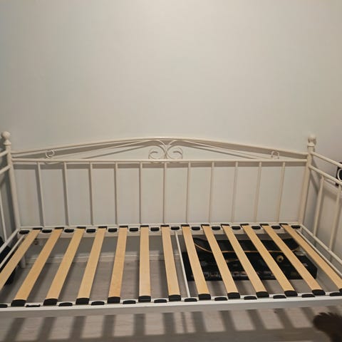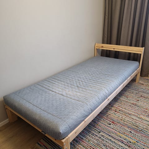 *Käytönjälkeä vähän; rungossa tarran tms jälkiä muutama(lähtee kunnon hinkkauksella), patjassa pieni tussin jälki ja sälepohjan pari nauhaa niitistä irti. Korjattavissa siis kaikki pienet moitteet.🙂