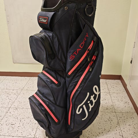 Muutaman vuoden käytössä ollut Titleistin Stadry vedenpitävä kärrybägi sadehupulla, jakaja 14:sta mailalle, ehjät vetoketjut, aurinko haalistanu väriä jonkun verran. Vedenpitävyyttä vielä on, mut ei enää viimesen päälle pitävä (esim. osa vetskareiden saumoista kuluneet, kts kuvat). Nouto Ristikivestä.