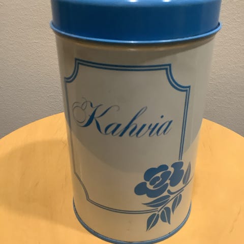 Aarikan peltipurkki ”Sokeria”. Korkeus 18cm, halkaisija 10,5cm. Ulkoapäin siisti, sisältä kuluneempi. Vain nouto.