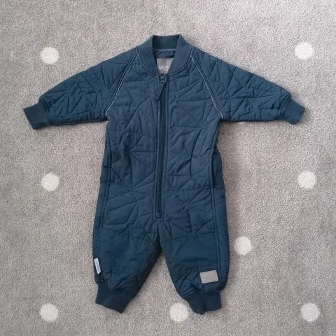 MarMar Copenhagen lastenhaalari sinisessä värissä, koko 62, unisex-malli. Haalari on valmistettu pehmeästä materiaalista ja siinä on huppu ja käännettävät hihat ja lahkeet.