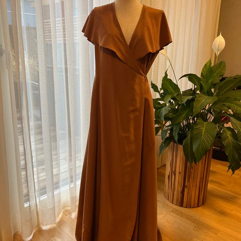 Andiatan silkkinen, musta ilta- tai juhlapuku. Takana vetoketju, halterneck kiinnitys hakasilla. Tyylikäs, mutta mukavan rento päällä.