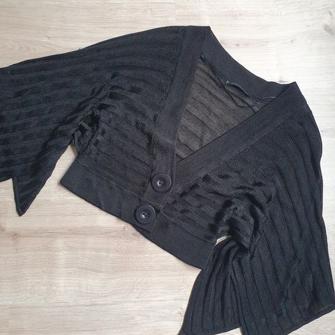 Hopeanvärinen Pieces bolero, jossa kimaltavaa lankaa seassa ja virkatut hihat. Koko S.