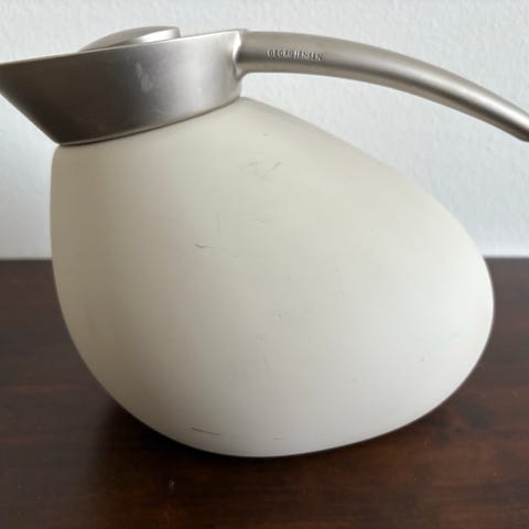 Myydään vintage Georg Jensen Aya termari termoskannu. Kannu on erittäin hyvässä kunnossa, mutta siinä on joitain pieniä käytön jälkiä (kts. kuvat) mustassa muovi/kumipinnassa. Tilavuus 0,9 L. Ruostumatonta terästä.