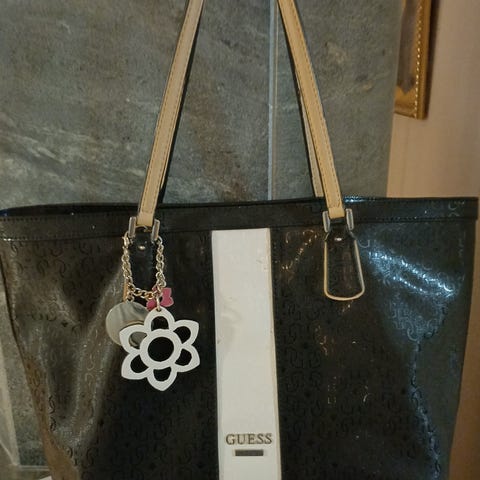 GUESS laukku valkoisella värillä. Laukussa on metallikoristeita ja vetoketjutasku takana. Sisäpuolella on useita osastoja ja kukkakuvioinen vuori.