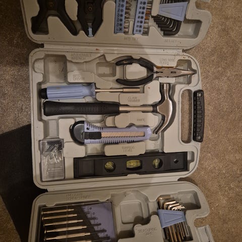 Myydään puinen / metallinen työkalu salkku (46x32x13cm) työkaluineen. Sisältää uusia ja käytettyjä työkaluja kuten paketeissaan uusia sisäkumeja , teräsharjoja , mittanauha , ruuvimeisseli , uusi polkypyörä äänitorvi , nitoja , kuusiokoloavaimia , hiomapaperia , pihdit , johdonkuorintapihdit , sakset yms. Toimitus salkkuineen muovipussissa. työkalu salkku niittipyssy sisäkumi teräsharja