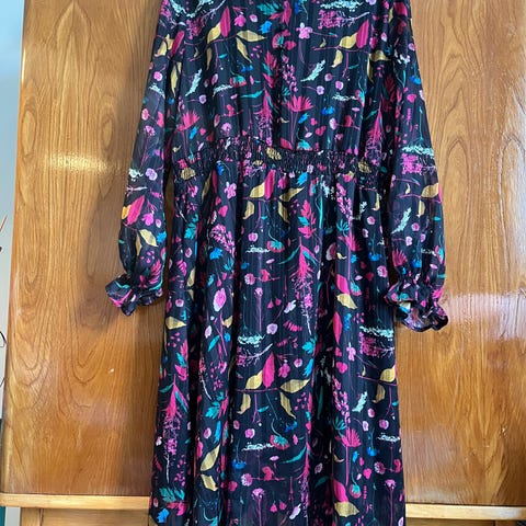 Petroolinvärinen mekko, jossa mustia kuvioita. Kuva vääristää väriä. Hieman alaspäin levenevä malli, taskut molemmissa sivuissa, solmimisvyö, rypytetyt hihansuut. Materiaali 96% viskoosi, 4% elastaani.