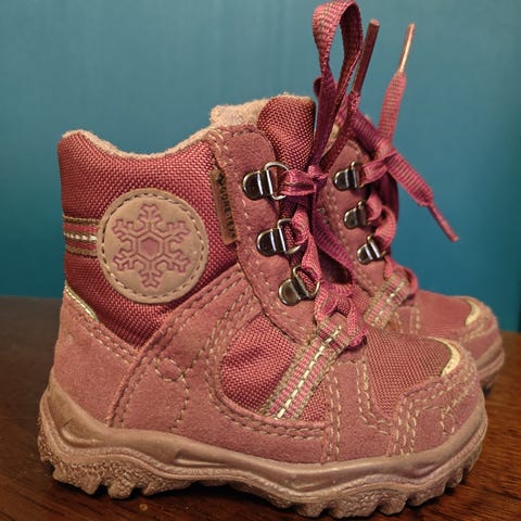 Käytetyt mutta yhä siistit talvikengät taaperolle. Meille oli hitusen jo pienet, niin eivät päässeet käyttöön. Tarroissa jotain pientä roskaa, mitä en poistanut kun ei vaikuta käyttöön. Myös pientä kulumaa tarrojen sisäpuolella (näkyy kuvassa). Toisen kengän etuosassa pieni kulumajälki (kuvassa).