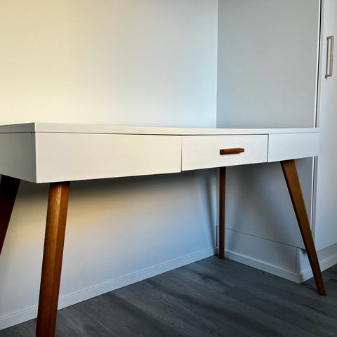 Erittäin hyvässä kunnossa oleva massiivipuinen, tukeva työpöytä pieneen tilaan. Kolme vetolaatikkoa. Kunto uutta vastaava. Pöytä löytyy nettikaluste.fi sivustolta Ranch 01 -nimellä (vain vetimet erilaiset). Hinta uutena 890€.