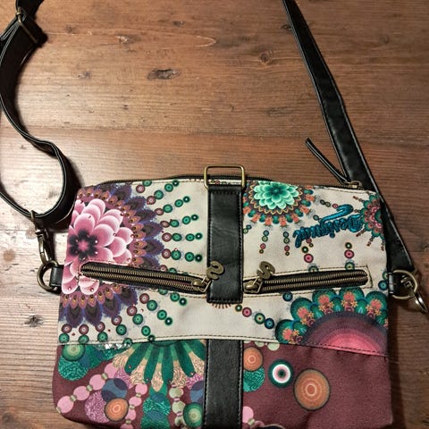 Desigual nahkainen naisten olkalaukku ruskeassa värissä. Laukussa on koristeelliset yksityiskohdat, kuten niitit ja kirjailu. Takana vetoketjutasku. Sopii arkipäivän käyttöön ja pienempien tavaroiden kantamiseen.