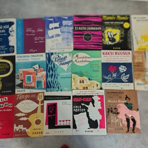 Huomio hanurin soittajat, vanhan tanssimusiikin ja vanhan kansanmusiikin ystävät, harrastajat ja soittajat ! Edesmenneen hanurinsoittaja-isäni valtava kokoelma nuotteja. Yhteensä 14 kansiollista, 4 pientä kansiota ja 10 A4-kokoista kansiota. Suurin osa nuoteista musta-valkoisia kopioita joissa lukee päällä minkä kappaleen sisältää. Mukana myös musiikkiliikkeistä ostettuja nuotteja. Nuotit jaoteltu ryhmittäin, valssit, tangot, humpat/foxtrotit, polkat, jenkat, kansanmusiikki ja sekalaisia. Nuotit on siististi laitettu ja teipitetty kansioihin, erittäin hyvässä kunnossa. Olleet lämpimässä varastossa vuodesta 1991 lähtien. Nuotteja on kerätty monia monia vuosia, en tiedä kuinka kauan. Myydään tilan puutteen takia. Tervetuloa tutustumaan kokoelmaan paikan päällä ! Hinta 15e/kansio
