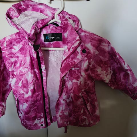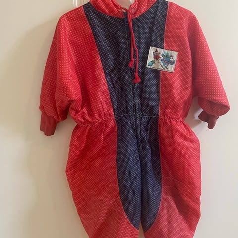 Yhdellä lapsella käytössä ollut tuulipuku. Kangas takissa ja housuissa ehjä. Pieni musta viiru takin vetoketjuläpässä, joka ei lähtenyt pesussa (näkyy kuvassa). Kulkeutuu kaupunkiin omien menojen mukana.