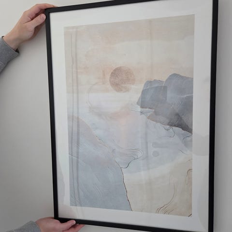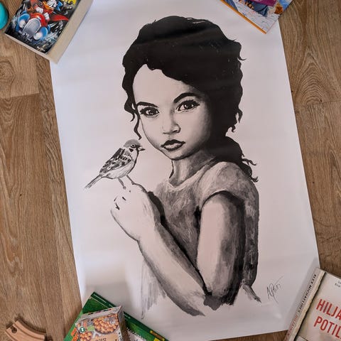 Taidejuliste, jossa valkoinen papukaija rullaluistimilla vaaleanpunaisella taustalla. Juliste sopii sisustukseen ja taidekokoelmiin. Ihana juliste lastenhuoneeseen. Koko 40x60 cm