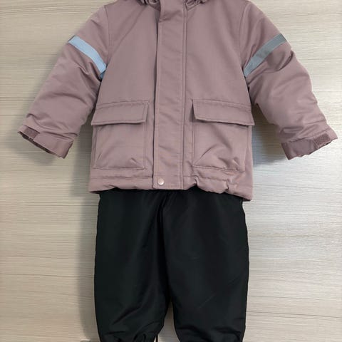 Haalean vaaleanpunaiset H&M henkselelliset /olkaimelliset fleecevuorelliset talvihousut ja talvitakki koko 92. Jalkalenksut ja säädettävät henkselit hyvässä kunnossa. Takana oleva heijastinosa ehjä. Polvien kohdalla ja lahkeissa tarkasti katsottuna hiukan tummumaa ja karheumaa, mutta yleisilmeeltään siistit. Housut ovh. 29,90.